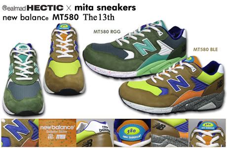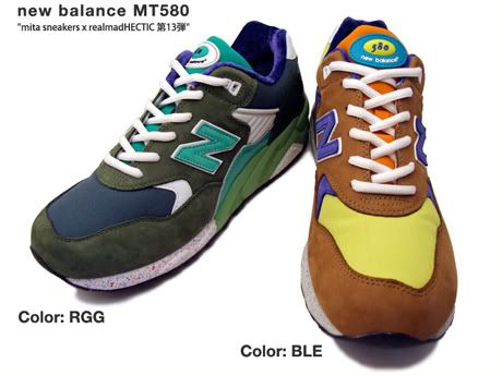realmadHECTIC et Mita Sneakers collaborent pour la treizième fois sur le modèle New Balance MT 580. Cette fois, deux coloris ont été réalisés: green/turquoise/blue et brown/blue/yellow. Elles sortiront le 30 août chez Mita Sneakers.
