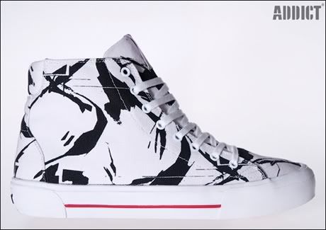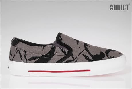 Addict Clothing vient de présenter sa toute nouvelle division Footwear! Les modèles sont nombreux et on retrouve des silhouettes classiques à la Vans, Converse, Pointer, etc. L’artiste She-One continue de mettre son talent au profit de la marque britannique avec son fameux camo pattern (ci-dessus et dans la suite).
