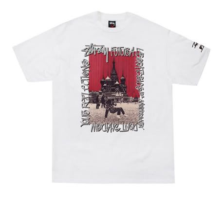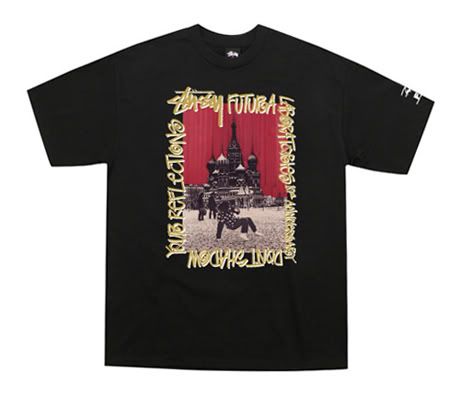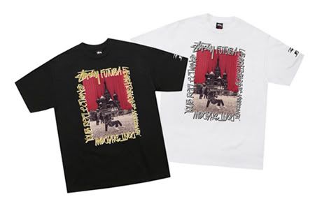 Il y a quelques jours, nous vous présentions une série de t-shirts (voir ici) réalisés entre Stussy et Futura Laboratories, pour fêter le 10ème anniversaire du label japonais créé par Futura. Voici aujourd’hui des photos d’un nouveau tee anniversaire. Sur la photo, Futura est entrain de breaker sur la Place Rouge, devant le Kremlin, durant un séjour en URSS en 1984.