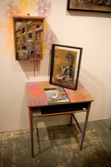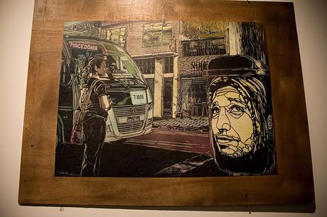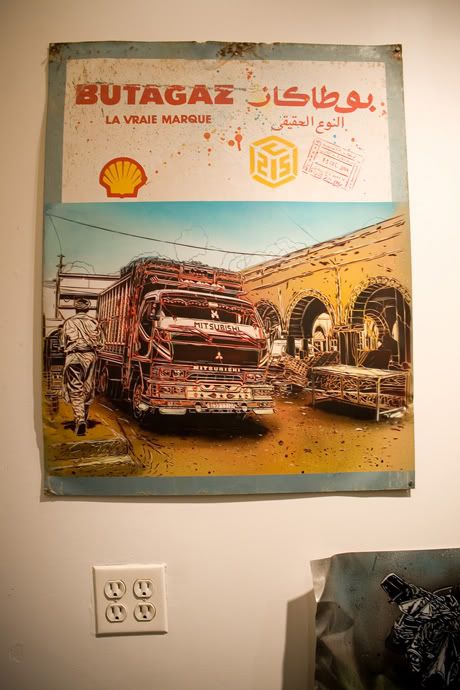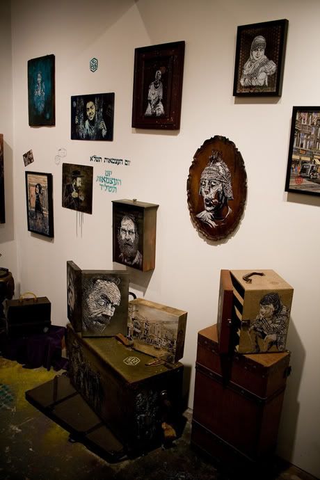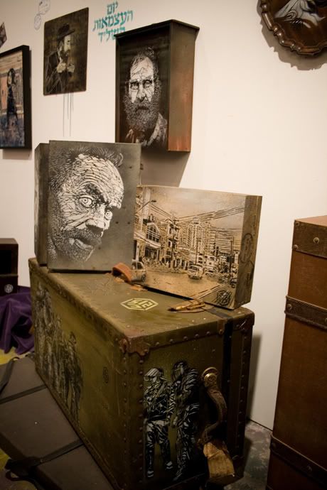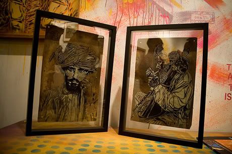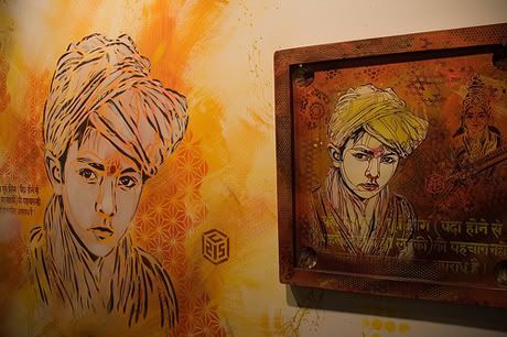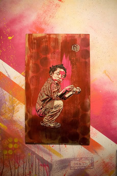 En parallèle de l’exposition commune Brooklyn Block Party (voir les photos ici), la galerie Ad Hoc Art de Brooklyn présente également depuis vendredi soir la nouvelle exposition de l’artiste français C215, intitulée Junk Store. Ce dernier y présente ses nouveaux pochoirs (sur bois, papier, objets trouvés) qui reflètent à merveille la personnalité des personnes qu’il a rencontré durant ses nombreux voyages, notamment en Inde dernièrement. Merci à Romain de Scarygraphy.
