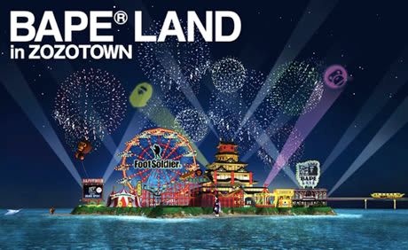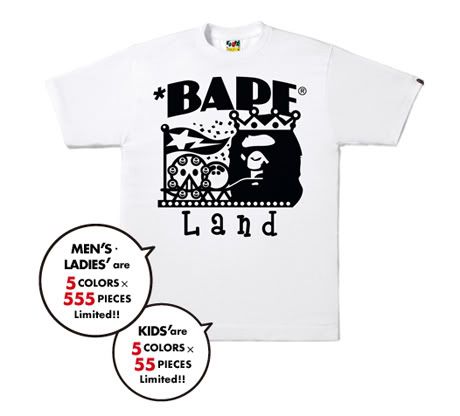 BAPE LAND OPENING & LIMITED TEE Lifestyle // mai 5th, 2009 Bape Land vient d’ouvrir ses portes sur l’espace virtuel de magasins en ligne, Zozotown. On y retrouve une tonne de produits de la marque à la vente (pour le Japon uniquement) et un nouveau t-shirt limité a même été créé pour fêter l’évènement.