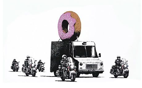 Banksy a annoncé la création d’une nouvelle sérigraphie inspirée par sa récente exposition dans sa ville natale, Bristol (voir ici). Donuts sortira en deux versions (strawberry et chocolate) et mesure 76cm x 56cm. Éditée à 299 exemplaires chacune, elles seront disponibles à la fin du mois par système de lotterie. Pour avoir une chance de l’acheter, vous pouvez vous enregistrer ici.