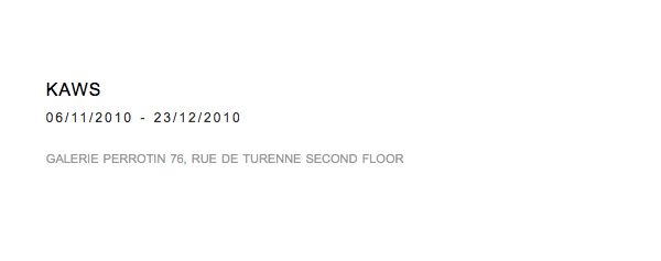 La Galerie Perrotin a aujourd’hui officialisé la venue de Kaws à Paris et ce à partir du 6 novembre, jusqu’au 23 décembre 2010. L’artiste new-yorkais y dévoilera de nouvelles toiles ainsi que quelques surprises…