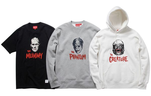Supreme rend hommage à la série de films d’horreur réalisé par les Studios Universal entre 1923 et 1960, Universal Monsters. Trois monstres sont à l’honneur: The Creature sur un hoody, The Phantom sur un crewneck et enfin The Mommy sur un tee-shirt. La collection sera disponibles dans les boutiques US de la marque à partir du 30 septembre.